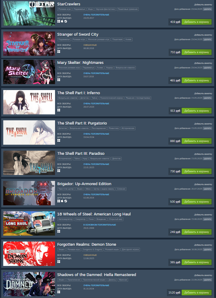 >>10057905 (OP) Хидденгемы ищутся не так. Всё равно тебе будут советовать всю популярную йобу. Все делаем как я. Открываем свой вишлист в стиме, сортируем по рейтингу продаж, исключаем ранний доступ и пререлиз. Листаем вниз и постим скрин с 10 последних.