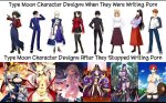 Лицемерная стыдливость. Все тот же хентай. Насу почему-то начал стесняться подросткового секса (с хуев ли?), и вымарывает его даже из старых работ. Что не мешает в той же гаче спамить сотни картинок лолей в трусиках и без, стоящих раком, с открытыми ротиками и озвученных буквально проститутками и фразами уровня "мастер, наполни меня собой". Ну и сиськи жопы, буквально любой арт - сексуализация всего и вся, тогда как в новеллах о подростках пубертатного периода тема секса почему-то неуместна и нинужна тут один долбоеб распинался в прошлых тредах, как ему ненужон секс