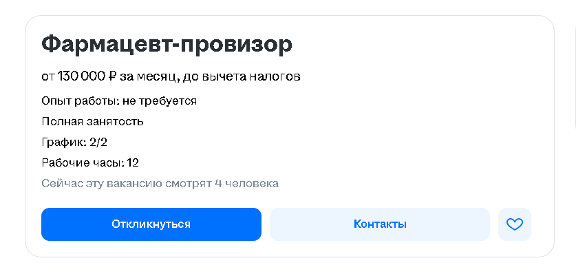 >>3258693 Блять, это хэхэ? Ты для начала устройся туда и получи зп, тебя драть будут за каждую не проданую доп. баночку бадов и витаминов будешь рублем отвечать. К моего коллеги жена главная в аптеке, сейчас уже региональный представитель какой то хуйни. Вся работа удалёнка, хз по деньгам не очень красиво. Эти 130 она и получает. Но правда ей под сраку лет и в трудовой только пара записей и те аптеки. Обычный микро фармацевт такие деньги не будет получать. Анон который вышку заканчивал говорил про реальные 50-60.