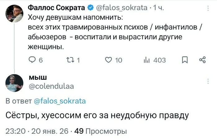 Ненавижу за реальные разрушения: демография в жопе, мужики в депрессии от матриархата, бабы одинокие с котами. Твоя "надежда на мамочку" — это твоя проекция, фемофил, а не аргумент. Феминизм сделал всех несчастными, и твоя попытка свалить на мужиков — типичный ретардский рефлекс защитника матриархата.