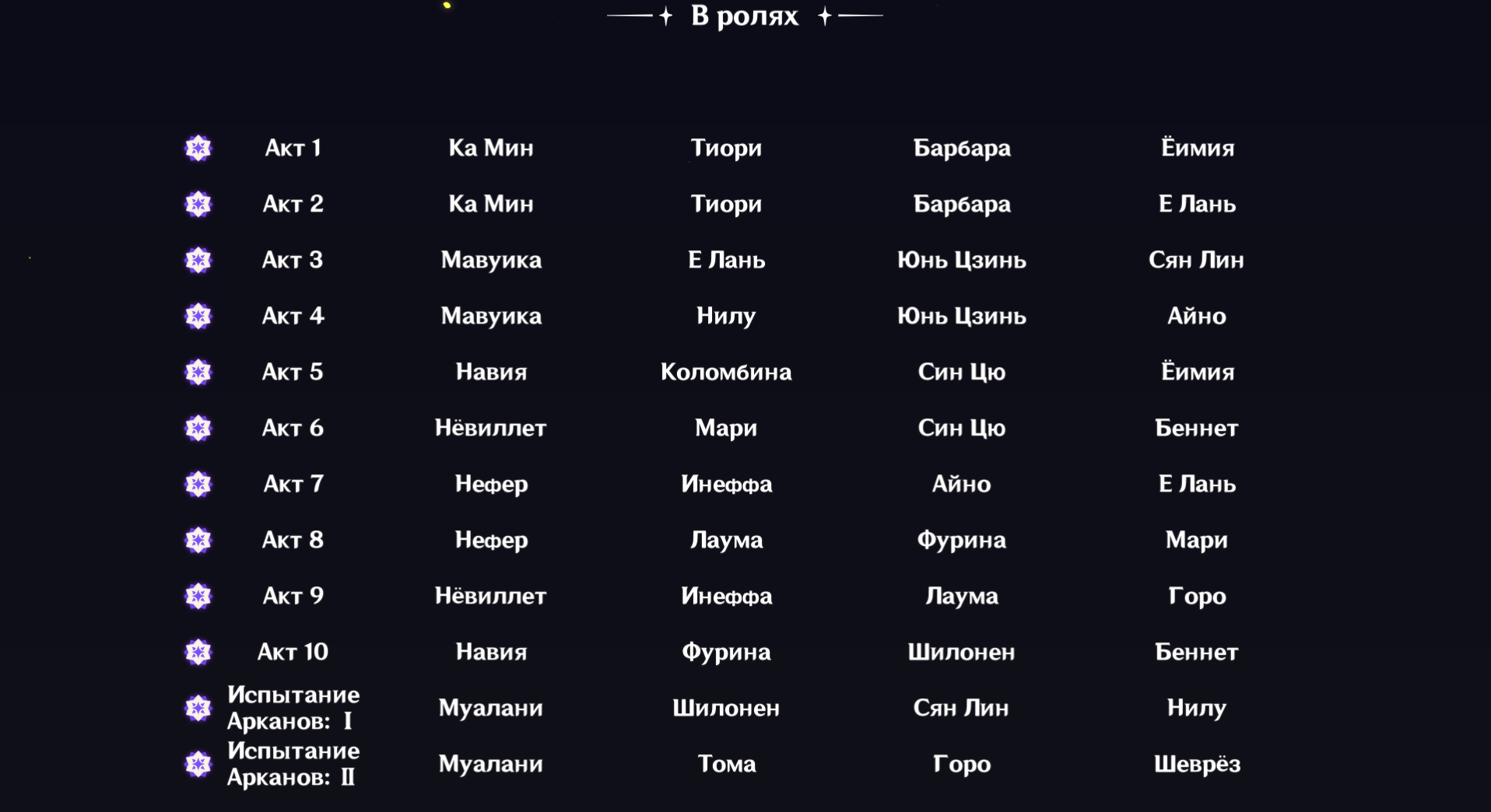 Как обычно катку тащат одни и те же, а всякие Дилюки чисто для массы, даже арты не стал вешать, ну типа, сириусли, Дашка там или Янка ещё что-то могут, но Торт, Дилюк и прочие падисары - это прям жесткий минус слот. Первый аркан выглядел стремно, по факту что-то отлетели на изи, с Барбариской даже не заметил каких-то там гео волн. Второй аркан странный, Флинсом заковырял, какой-то странный моб из Натлана, не помню таких. Боссы изичные, главное чтоб на петуча была Фурина, иначе духота со сбитием остальные не особо бузят, даже у последнего босса щит не особо крутой, можно пробить Шеврезом, если есть с4, ну или вот Мопед с Навией осилили.