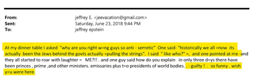 Электронные письма Джеффри Эпштейна содержат многочисленные оскорбления в адрес неевреев и утверждений о превосходстве евреев над неевреями