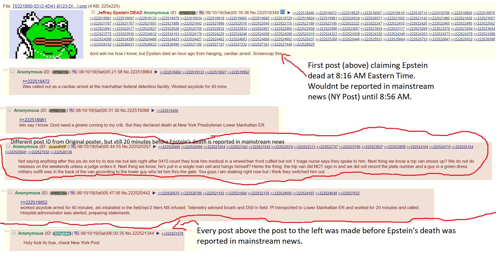 Теперь у нас есть подтверждение того, что публикация на 4Chan от 10.08.2019 — это подлинное свидетельство очевидца, надзирателя тюрьмы MCC, о том, что Эпштейна, возможно, подменили до того, как стало известно о его предполагаемом самоубийстве.