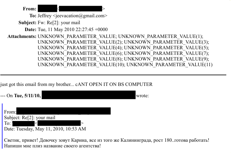 Вот судя по всему Карина (которая Шмурдяк или как ее там) пересылает Джефри письмо на русском. Джеф, скорее всего немного знал русский. Кто-то в треде спрашивал