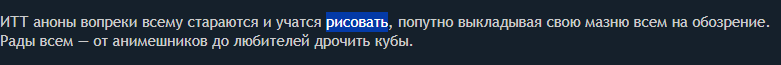 ИТТ аноны вопреки всему стараются и учатся рисовать, попутно выкладывая свою мазню всем на обозрение. Рады всем — от анимешников до любителей дрочить кубы.