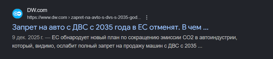 >>329344278 Так речь не про нефть в целом или экономику. И не про курс на электрофикацию. Это чисто про зеленые законы. В ЕС действуют жесткие нормы по выбросам для всего автопарка.