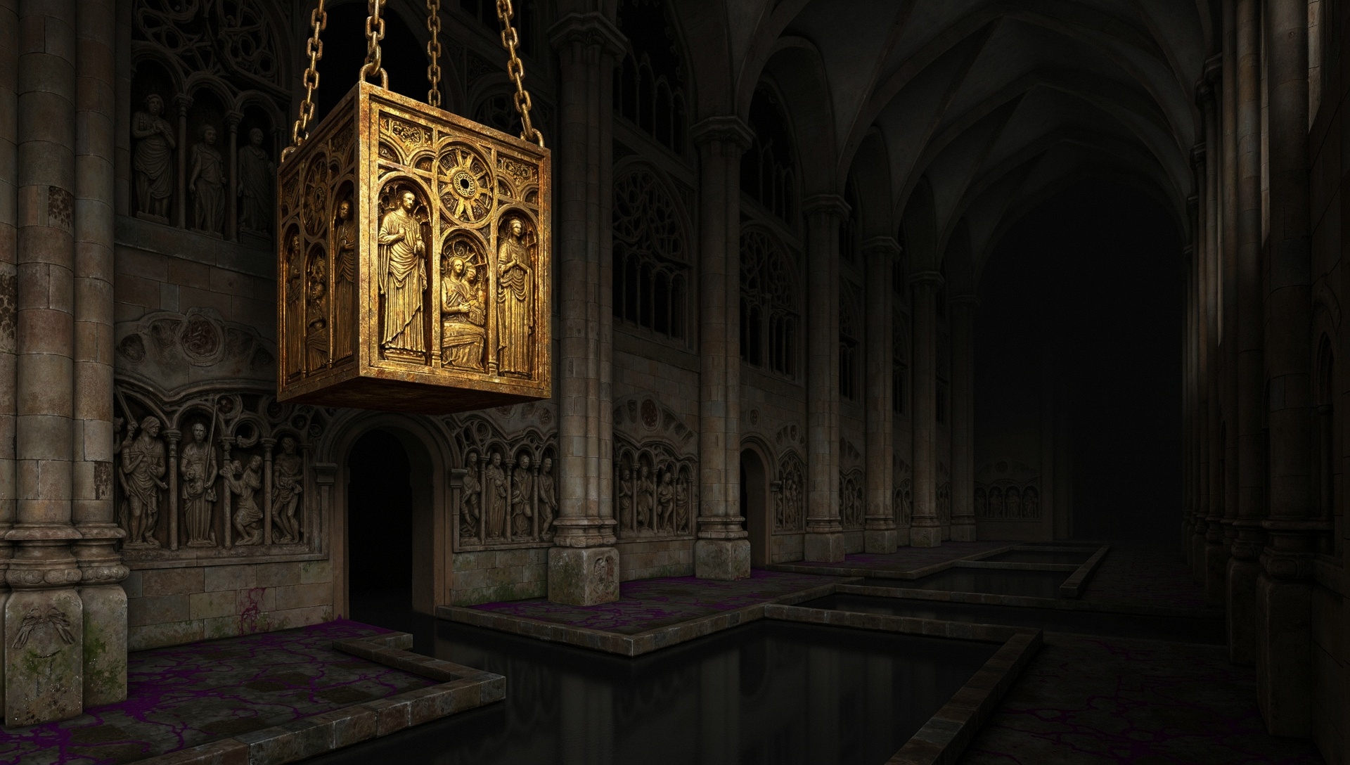 Золотой куб с рельефными гравировками и барельефами, рассказывающими о какой-то святой истории, висит на массивных золотых цепях в тёмной и колоссальной проклятой древней подземной локации, напоминающей одновременно канализацию и огроменный, длинный зал замка с колоннами и мрачной архитектурой. На дне видны тёмные текучие воды, а на стенах и столбах снизу - налёт проклятий с еле заметной цветастой текстурой, как у бензина в луже. Золото потускнело от времени и проклятий. Локация настолько массивна, что куб с рёбрами более двух метров выглядит совсем небольшим. Куб расположен даже не по центру - он просто висит на цепях между столбами у потолка в углу локации.