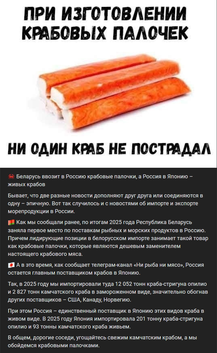 Я понимаю если бы ты снял на Камчатке цену на краба, а потом цену в Японии, и в Японии бы краб стоил в 2 раза дешевле. Но такого быть не может, иначе кабанчики бы уже давно скупили всех крабов в Японии и продавали в России.