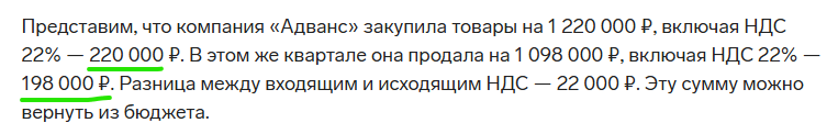>>61790738 Не уплатят. Существует такая штука как "зачёт НДС". У тебя даже на скриншоте об этом написано. Компания "Адванс" в данном примере не только не будет уплачивать НДС 198 000 который они получили с продажи товаров, они ещё могут попросить чтобы им из бюджета вернули 22 тысячи рублей. Это то, что написано на твоём же скриншоте. НДС это налог который ложится всей тяжестью именно на конечного потребителя, то есть степашек. Кабанчиков он как раз, по сути, не затрагивает. Исключение - мелкий бизнес работающий на УСН (который и так ебут), патентах и прочем.