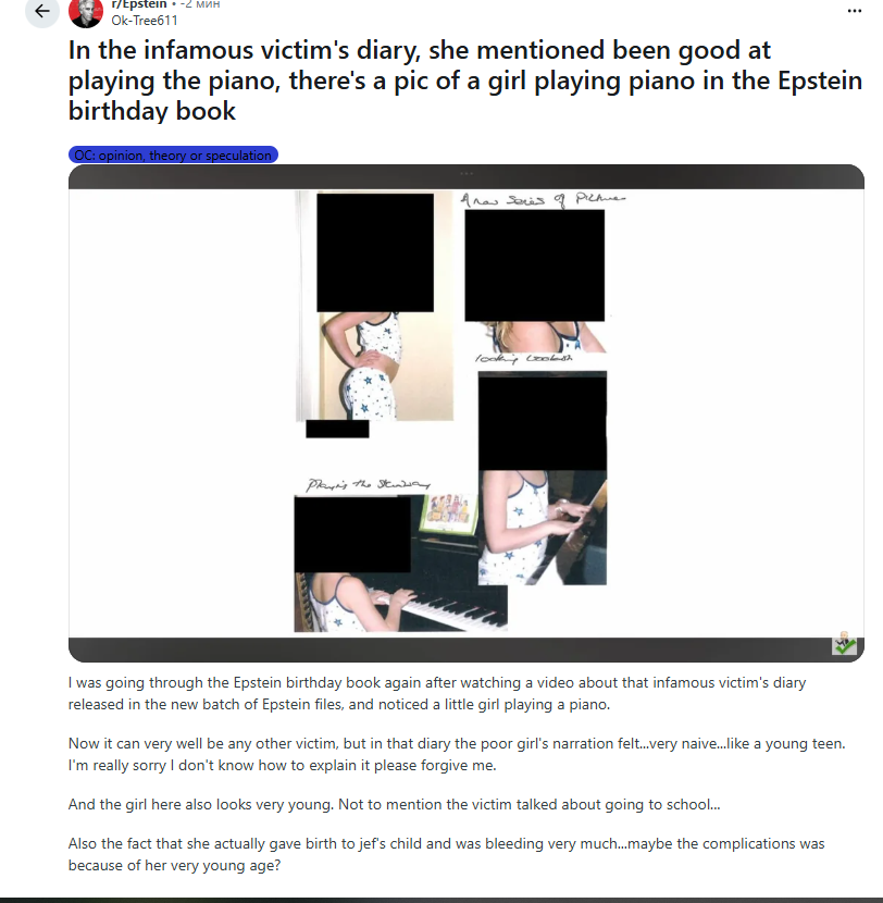В печально известном дневнике жертвы девушка упоминала, что хорошо играла на пианино; в книге, посвященной дню рождения Эпштейна, есть фотография девушки, играющей на пианино. И обратите внимание, на первой фотке есть животик (т.е. она беременна)
