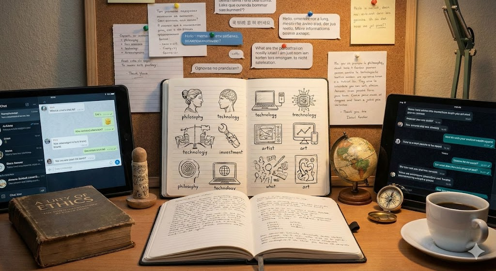 Важно, что ни один элемент не доминирует полностью. Они сосуществуют, иногда противореча друг другу. Это ключевой смысл работы: мировоззрение не как готовый ответ, а как процесс. Здесь нет утверждения «вот истина», есть честное признание — человек собирает себя из философии, науки, истории, веры, сомнений и личного опыта.