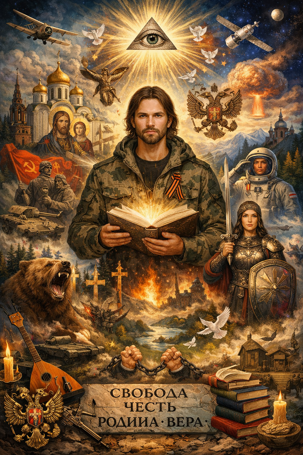 За центральной фигурой — ангельский образ с крыльями. Он не столько религиозный, сколько архетипический: идея защиты, совести, внутреннего наблюдателя. Над ними — всевидящее око в треугольнике, символ осознания, наблюдения за реальностью и понимания того, что ни одна система взглядов не является полной сама по себе.