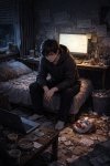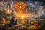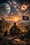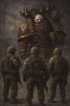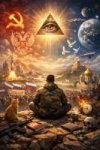 Центральная фигура, сидящая спиной Это ты как наблюдатель, а не участник. Позиция спиной к зрителю — знак интровертного мышления, привычки смотреть на мир целиком, а не играть роль внутри сцены. Камуфляж и берет — не «война», а готовность к реальности: ты не наивен, ты ожидаешь сложного мира.