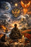 В центре композиции — фигура в медитативной позе на лотосе. Это не конкретный персонаж, а символ сознания: точки равновесия, где сходятся разум, вера, сомнение и поиск смысла. Лотос традиционно означает рост через хаос — чистоту, возникающую не вопреки, а благодаря сложности окружающего мира.