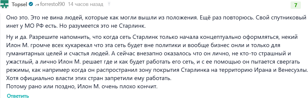 А нах нужен военным старлинк? В дискордике пересылать сообщения? Ну дык можно вайфай раздать от проводного инета - один хер фронт стоит - там у людей консольки уже в землянках где они сычуют месяцами. Не, я понимаю когда там мувы уровня барбароссы или бури в пустыне и вам нужна маленькая беспроводная хуитка, но тут то нахуя. Попахивает договорнячком мол кляты пендосы вырубили связь давайти СВОрачиваться.