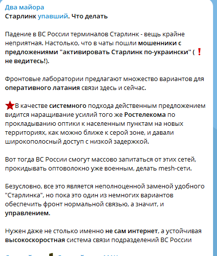 «Два майора»: Хотелось бы отметить, что мобильные терминалы Starlink — это единственная вариация для обеих сторон конфликта в качестве спутникового интернета. Других нет. У Украины понятно, а в нашем случае, как бы кощунство не звучало, «аналоговнет".