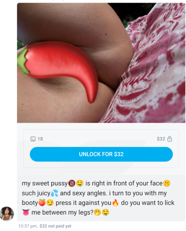 Где-то месяцев 6 назад купил у неё контент за 20$ она тогда ещё не делала превью к своим пакам,чисто описание а превью нет, кря купил, повелся на описание, так там чисто фото в пару видео в купальнике. Но это ладно,фиг с ним что она мне за 20$ продала контент такой что бывает у неё в инсте .идее откровенней, но знаете что? Спустя пару месяцев она видосы из моего пака начала просто в рассылку раскидать бесплатно, то что я купил,она решила бесплатно рассылать. Понимаю что 20$ не деньги, но с другой стороны, за 20$ можно купить бутылку неплохого вина, да и не все миллионеры, чтобы 10 фоток и 2 видео на 5 сек, уровня ниже мнсты за 20$ покупать.