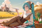background:Hills with a castle. Blue sky with clouds. | girl, hatsune miku, flat chest, brown headscarf, medieval peasant-style brown dress, blouse, corset, blush, tsundere, holding paper airplane, lying, aqua nails