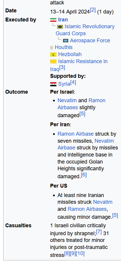 >>1290844 Хизбала начала обстреливать Израиль 8 октября 2023 года и год выносила города на северной границе, под дирижирование иранских генералов, пока Израиль занимался хамасом. В какой-то момент терпение лопнуло и этих генералов вынесли вместе с хизбалонами на встрече 1 апреля 2024. После чего 13 апреля Иран массированно обстрелял Израиль беспилотниками и ракетами. Все. Какой тебе ещё нужен формальный повод, дебс? >там какое-то говно за три копейки из водосточных тру Из емена за 2000 км долетает? >Эти страны находятся в состоянии войны с государством-террористом с 49 года. В 49 году не было ни хуситов ни ХАМАСа ни хизбалы ни ксир..