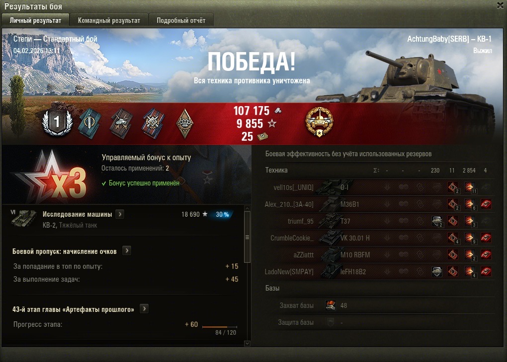 Чет проиграл со взвода кв-2, один точно афк стоял весь бой, второй видимо все-таки поиграл, выстрел сделал один без результата. Вот интересно, с какой такой блядь радости им вообще опыт насыпали?