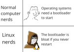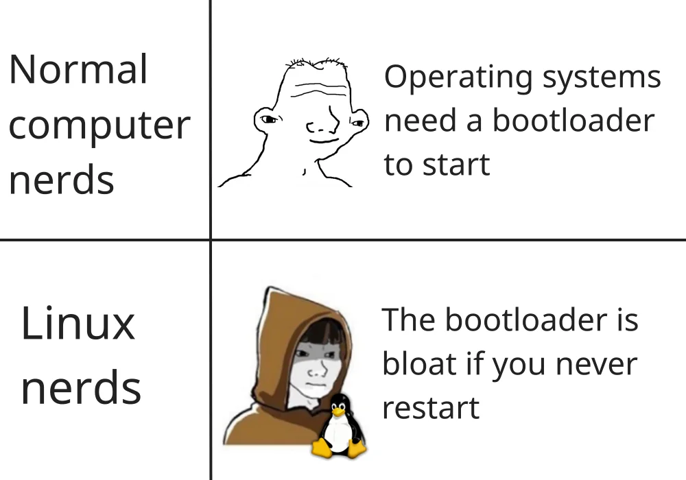 >>3671547 Справедливости ради, винда у меня тоже месяцами без перезагрузки жила, тупо потому что мне было лень опять три часа вычищать то что насрано обновлениями и возвращать свои костыли на место. Ну и браузер будет полдня вкладки прогружать, а так уже всё открыто и на месте.