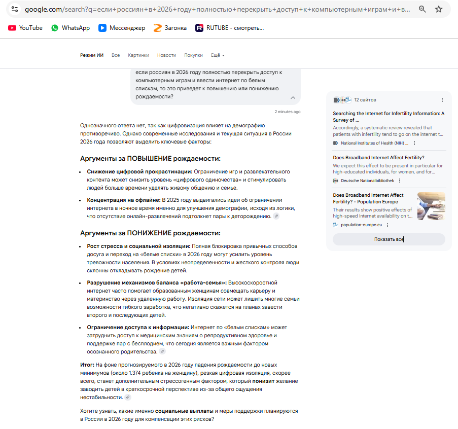 Если спросить у гугловской нейросети "Приведет ли полное отключение интернета в РФ по белым спискам в 2026 к повышению или понижению рождаемости?" - то гугловская нейросеть отвечает что скорее всего к понижению рождаемости