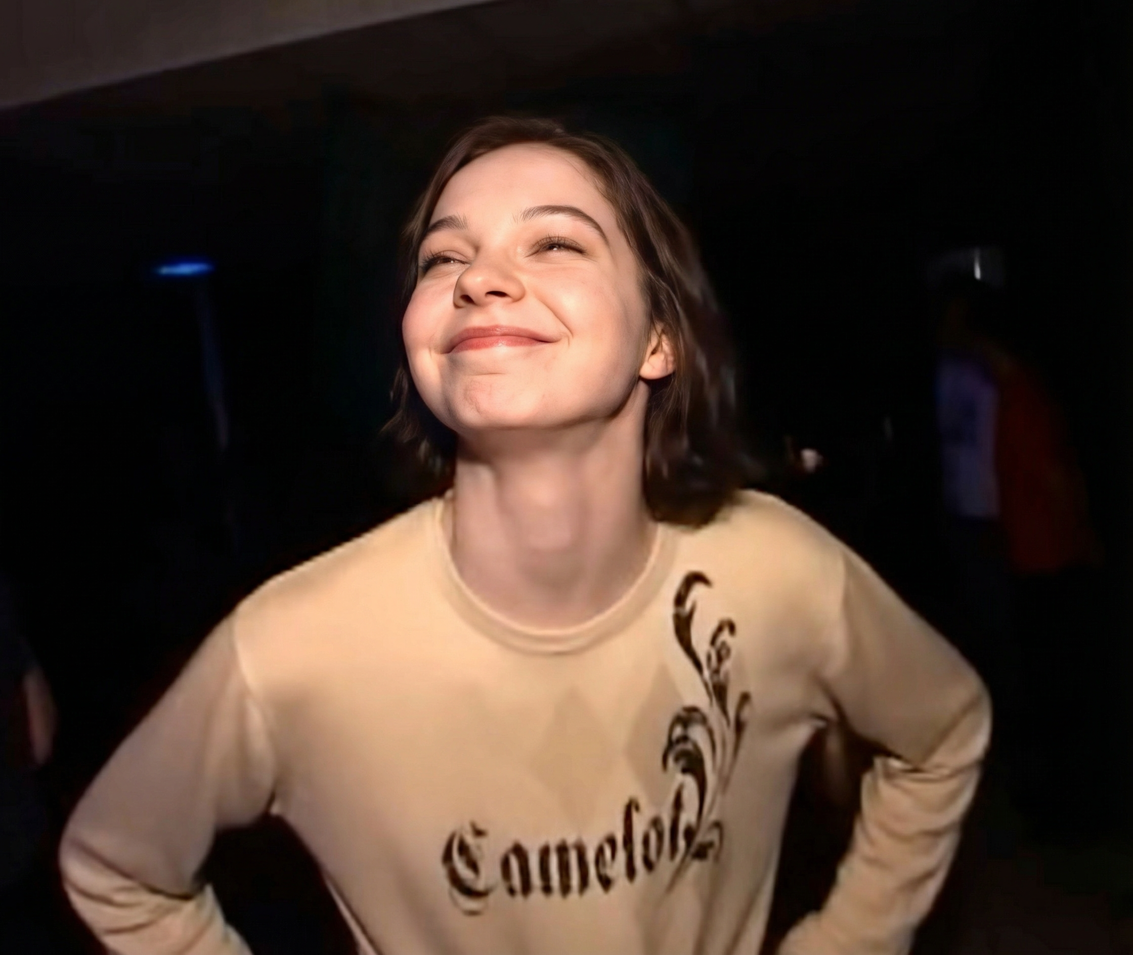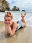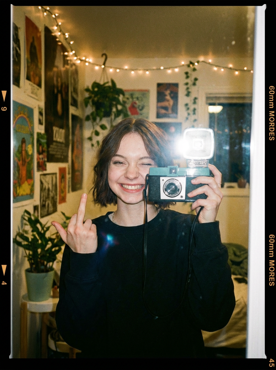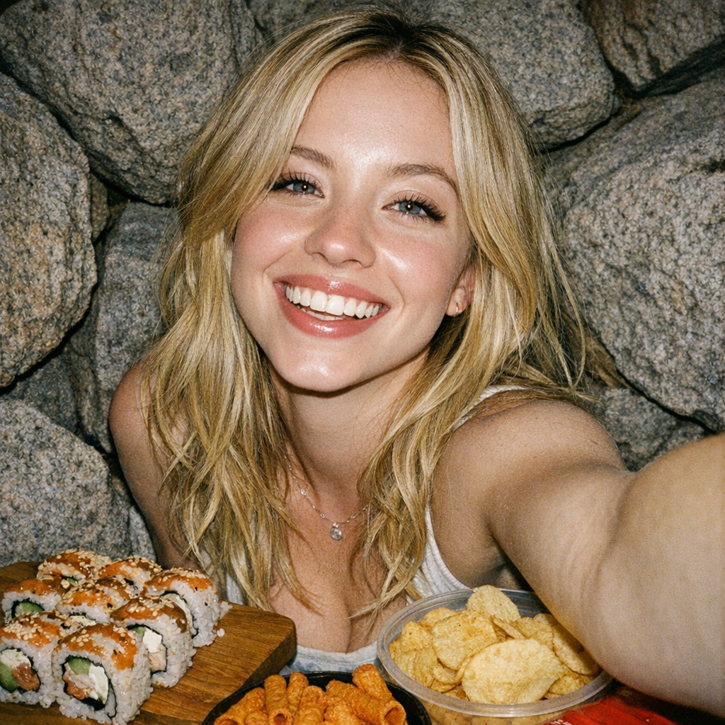 >Эмма Майерс красиви добри миловидна делает селфи, руки за кадром, лыба, без рыбы, онли глыба, рулетики, чипсеки, вайбит по кайфу, фото со вспышкой снято на старую 60мм камеру, сзади камни красиви, чисти фото 3:4 стороны