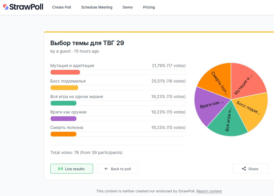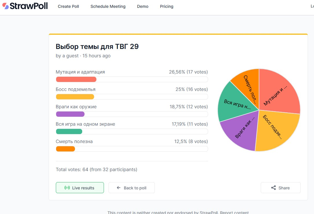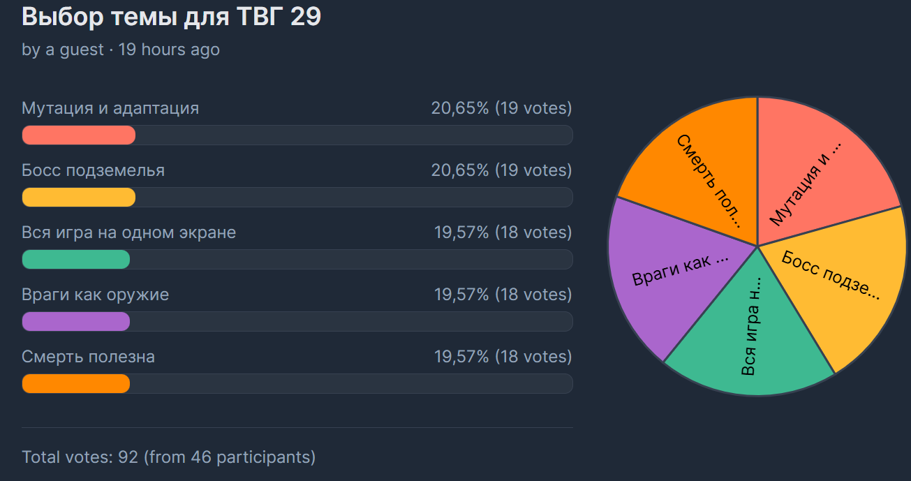 >>1072287 На первом скрине уже накручено еблан. Ты повелся на очевидный бейт... Там за пол дня шесть голосов было, ты хочешь сказать что за ночь набралось еще 30? Тут столько человек не сидит. Кстати этот сайт заблокирован в РФ а с публичных впн не факт что засчитывает. Короче кто как хочет а я делаю на тему Смерть полезна. И остальным предлагаю выбрать любую из тем в голосовании, а не те которые дэбил по кличке оп с помощью накрутчика выбрал.