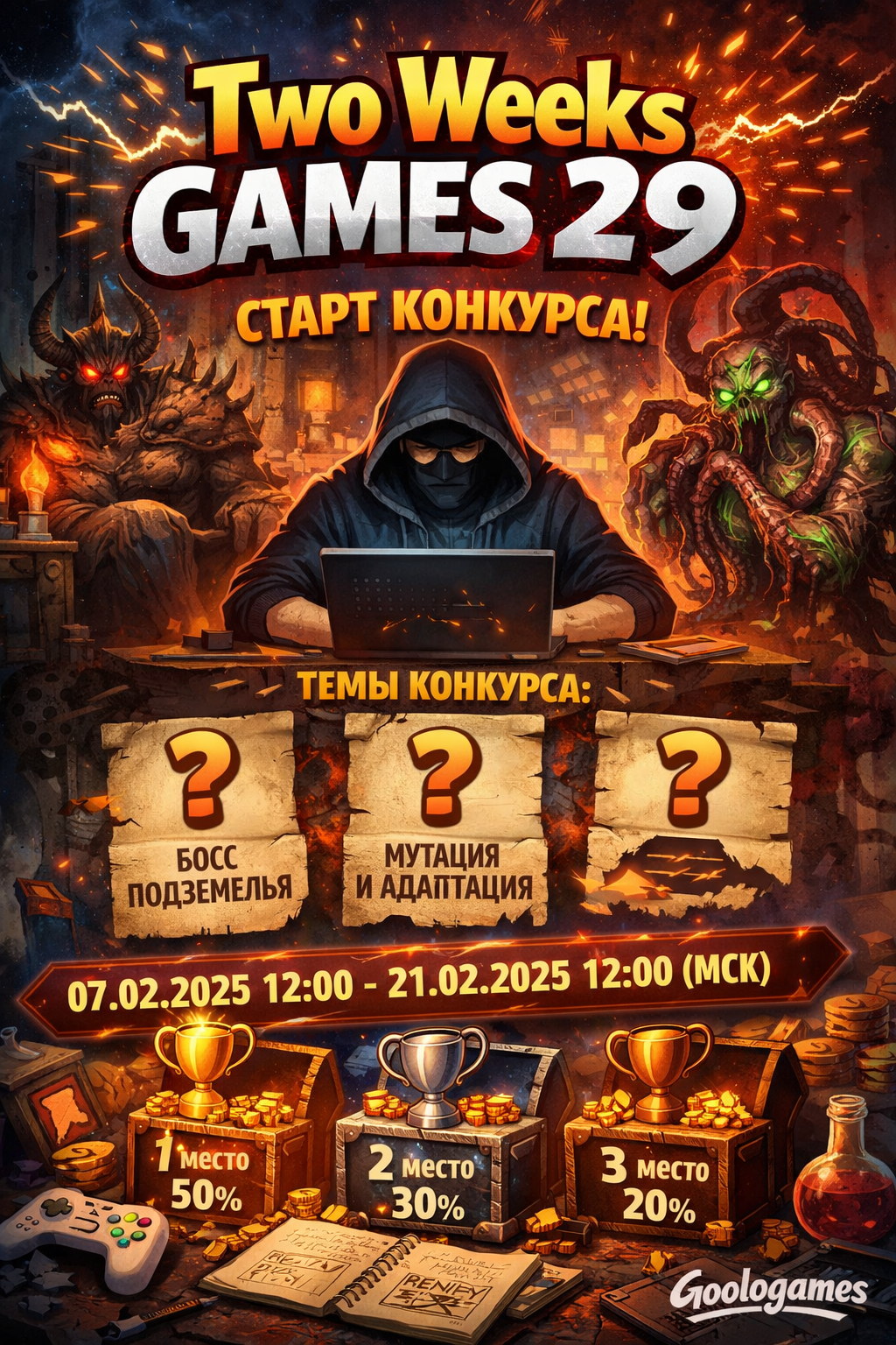 Темы конкурса: Босс подземелья, Мутация и адаптация. В приоритете на призовые места будут те игры, авторы которых постараются нормально раскрыть обе данные темы одновременно.