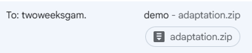 Отправка игры: 1. Игра отправляется на почту организатору. Отправляйте игру ссылкой на одно из облаков. ЯДиск, Google Drive, Mega, Dropbox или другие адекватные. Лучше всего Mega - бесплатные 20 Гб это круто! 2. Игра должна быть упакована в архив, желательно избежать применения инсталляторов. По названию архива должно быть понятно, что в нём за игра. 3. Вес игры не должен быть более 10 Гб. Билд игры не должен содержать лишнего неиспользуемого контента вроде папки из unity "do not ship", также по возможности используйте сжатие спрайтов/музыки. 4. Рекомендуется приложить к билду скриншоты вашей игры и обязательно сделать readme.