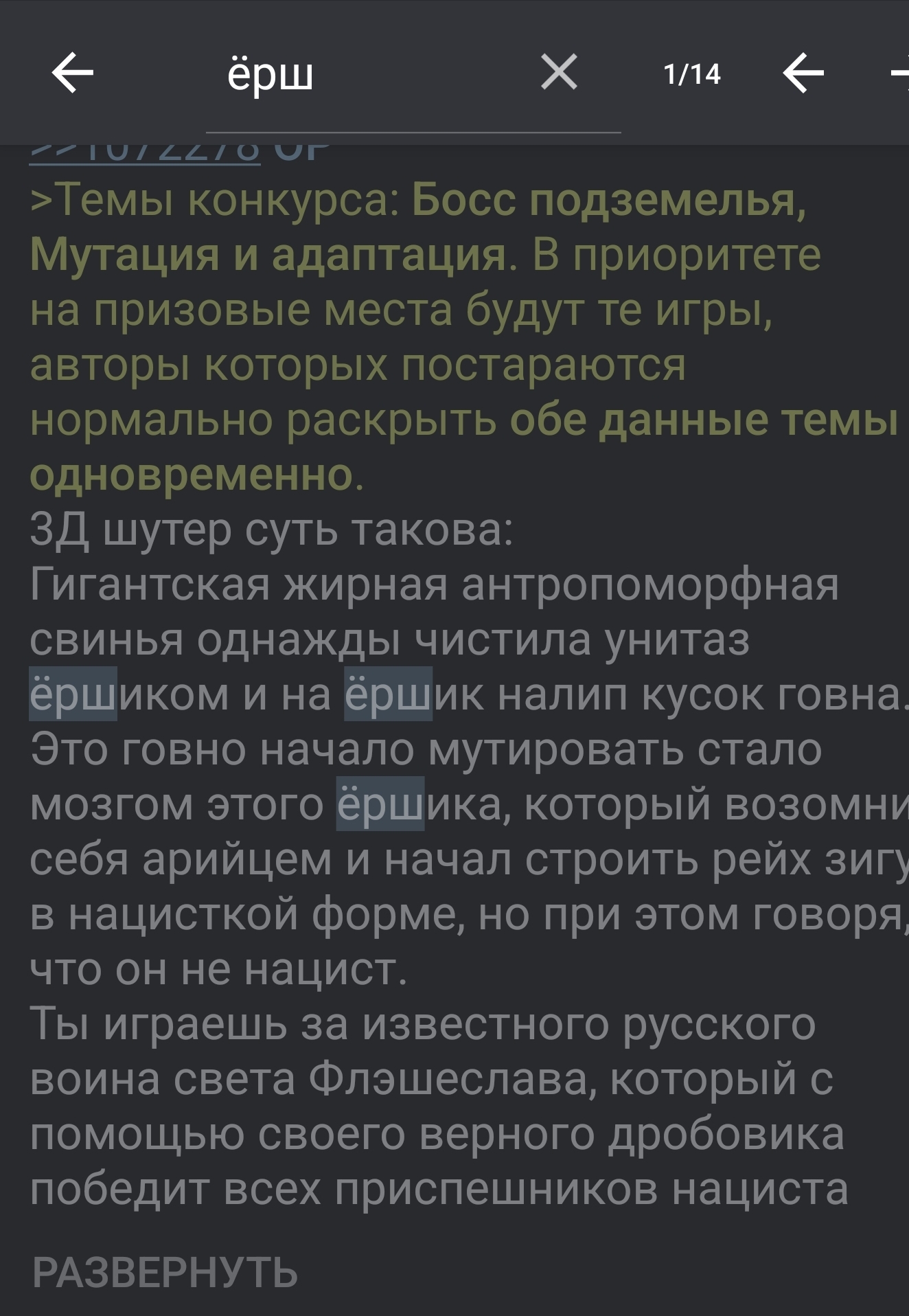 >>1073879 Для меня наоборот 1-3 дали основной сигнал, а личность орга уже не так сильно играла бы роль, если бы сам конкурс был на уровне, но похоже это неотделимо. Несмотря на усиленный форс, что тут одни шизы, мне кажется, что на весь твг от силы 3 шиза, причем двое борются против третьего и против раздела, а третий борется с этими двумя. И самое смешное, что ни один из этих шизов обычно не участвуют в твг. Вне твг ещё трое-десять наберётся, но большая часть из них не сопоставима с тем, что творят шизы вне гд. >>1073905 Важное обсуждение для будущих оргов