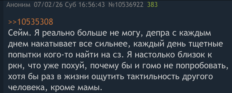 >>329560619 Они там написали,что тоскуют по тактильным ласкам, обнимашкам и т.п.Дрочка этого не даст.Ты ткстиа с кем-то вжизни целовался кроме бабушки и мамы, фап-герой?