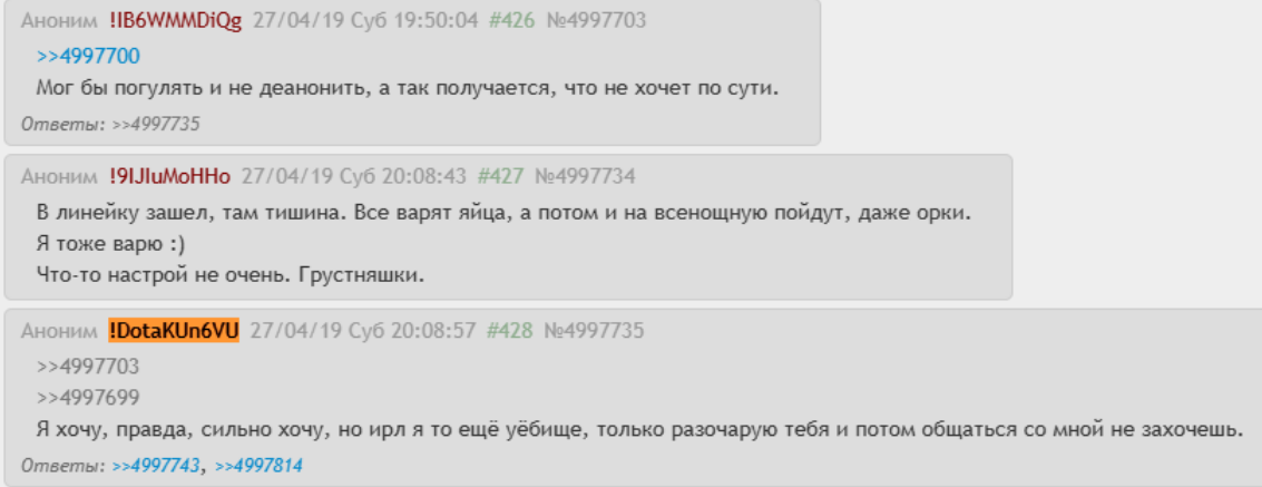 >>5687919 >Спасибо что расписал. Но всё же, мне очень трудно верится, что челик готов идти прям ДО ТАЛОГО, чтобы кому-то сделать больно. А впрочем... Не за что. Имиджборды и в частности двач - одно из самых токсичных мест в ру-сегменте Интернета. Тут много озлобленных психбольных неадекватных людей, которые живут травлей и унижением других людей. Тут люди готовы платить деньги, лишь бы их неприятелям сделать плохо (заказать деанон ирл для "лулзов", задоксить по "приколу", избить в жизни на камеру чтобы посмеяться и потом постить видео с избиением по всему двачу). Чего удивляться что они способны и на постоянную ложь, клевету, изощренную травлю с использованием третьих лиц и вообще случайных людей, для них это легко.