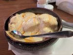 Мисо суп с креветками и говяжьим фаршем, шампиньонами и безглютеновой лапшой из чёрного риса, а также яйцом. Бульон хондаши, паста мисо. Чутка соевого соуса.