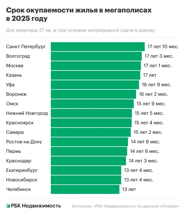 Оценивался срок окупаемости за счет сдачи в аренду квартиры площадью 37 кв. м, приобретенной на вторичном рынке. Использовались данные по ценам предложения и арендным ставкам, актуальные на 2025 год. Подсчеты выполнены при условии, что квартира приобретена без использования ипотечного кредита, а в аренду она будет сдаваться непрерывно по ставкам, актуальным на текущий год. Дополнительные расходы, которые могут возникнуть в процессе окупаемости жилья (имущественные налоги, затраты на ремонт и обстановку), не учитывались.