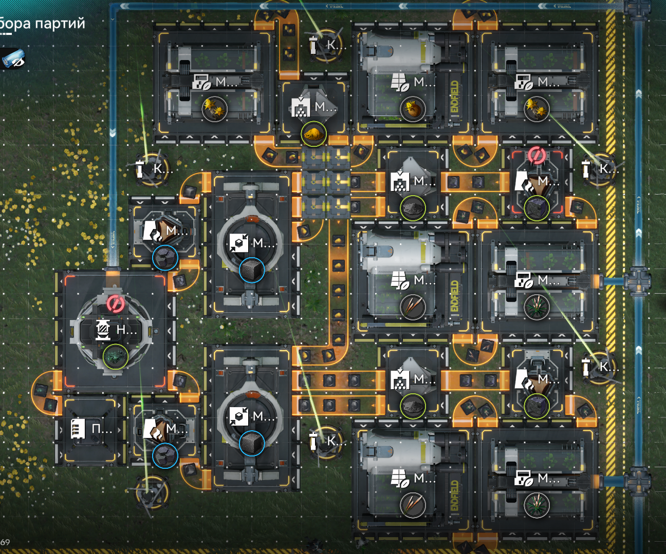 >>6394450 Для понимания как это работает. Ориджеода крутится в цикле параллельно с батарейками, регулируя пропускную способность по батарейкам от 1 до 1/3. Длина цикла ориджеоды 18 клеток. Изначально загружаете туда 12 ориджеоды через нижний запасник, и это устанавливает пропускную способность объединителя с батарейками в 1/3 от полной. Верхний запасник работает как реле. Вы загружаете туда 250 угля и 23 феррия, и этот феррий там крутится бесконечно, блокируруя вход ориджеоды. Важно, чтобы запасник был отключен или работал в режиме хранилища, не отправляя ресы в склад. Если энергия кончается, верхний запасник начинает пропускать ориджеоду, уменьшая число ориджеоды в контрольном цикле. Это увеличивает пропускную способность по батарейкам до максимума в полную линию, если вся ориджеода будет удалена. Чтобы обратная связь не отсасывала ориджеоду слишком быстро там стоит на 16 разделитель внизу. Это позволяет за один даунтайм вытаскивать не более одной ориджеоды, увеличивая мощность не более чем на 333.