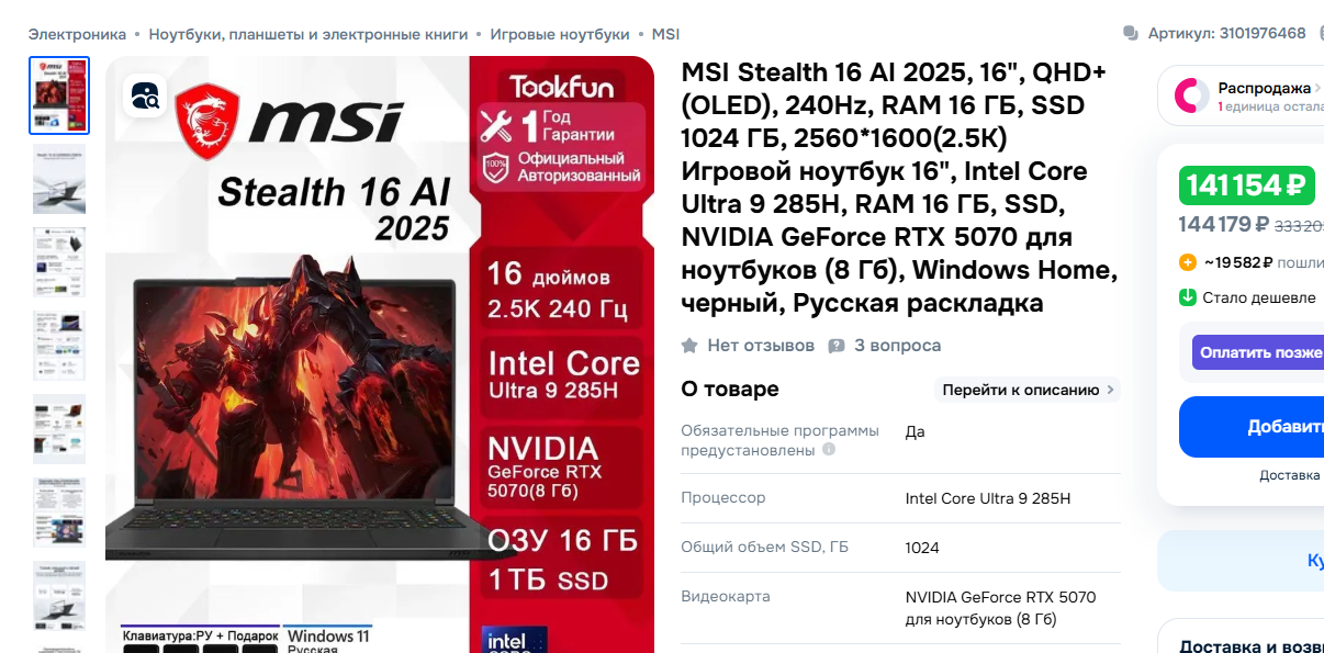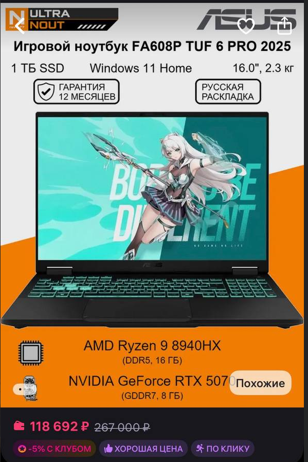 Доброго времени суток. Нужен ноут для игор (кс2 и новьё) и работы (таблицы, пдф, ничего ресурсоемкого). Часто мотаюсь по командировкам, нужно чтоб был с собой всегда. Имею хороший пк и на данный момент легион Y540 на 1660ti. Что нужно: 17-18" От 5070ti 32 оперативы и 1тб ссд, но тут пох вообще ибо сейчас везде вариативно, всегда могу докупить. Что сам присмотрел - это пока только msi raider https://www.ozon.ru/product/msi-igrovoy-noutbuk-18-amd-ryzen-9-9955hx3d-ram-32-gb-ssd-nvidia-geforce-rtx-5070-ti-dlya-3166756223/ до нового года видел подобный по 179, с учетом пошлины уложился бы примерно в 200к, но сейчас уже дорого. Хотелось бы до 200к.