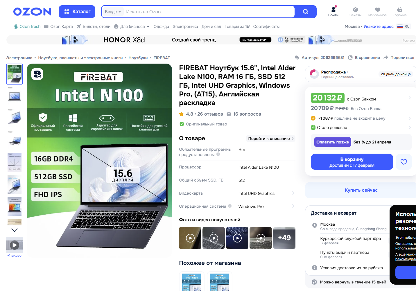 CPU - Intel Core 3 N355 (8-ми ядерный, как ни странно это) RAM - 8 ГБ SSD - 512 ГБ
