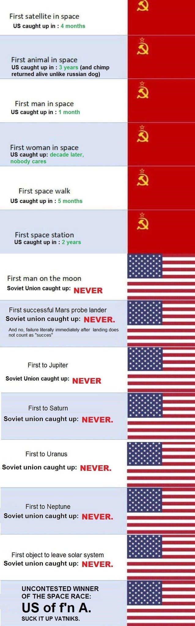 >>61859193 Ну, а что же тогда противник не кукарекал во всю, а признал? и спутник признал и леонова признал и терешкову и станции на луне, марсе, венере и луноход Гагарина даже радиолюбители спелинговали во время полёта ВРООООТТТИИИИ а вот странно одно, что даже ща на луну не знаю как лететь пиндосы, как радиацию проходить, и это со всеми технологиями, а тогда 50 лет назад якобы могли ага лол кубрик перед смертью сказал, что в голливуде сняли