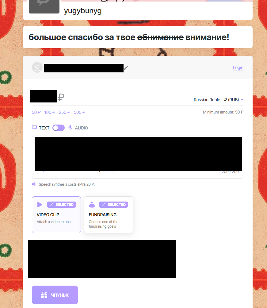 >>26258743 обязательно нужно выбрать ттс свой любимый за 26 рублей (чтобы она точно поняла что это ты) и приложить музыкальный клип, который бы отразил все те эмоции что ты испытываешь, чтобы она поняла всю глубину твоих чувств и мотивов. выбирай с умом, ведь это твой последний донат, другой возможности может и не быть