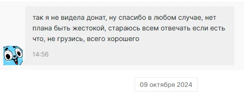 потом ещё мои сообщения в донатах всплыли на стриме, хотя я просто хотел выговориться. я не хотел их публичного обсуждения (а задонатил потому что забанила и недала высказаться в личку, могла бы и не читать, просто дать сказать)