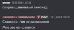 >>26258344 >чё хочешь 1. сначала хотел посмотреть тянукус 2. потом после суточного бана за нихуя хотел отписаться и отфоловился, в 10 из 10 раз для меня это был бы конец, я ненавижу истеричный людей, которые так поступают 3. потом наверно пожалел когда она попросила кого-то зафоловиться, а я просто без фолова ничё не писал смотрел халфу мою любимую игру/серию детства, из-за чего я и донатил после стримов (не хотел к себе лишнего внимания и не планировал оставаться дольше, чем халфа длилась) 4. она как-то очень тепло встретила и хз может вот тут была романтизация, мне это понравилось 5. но потом игноры какое-то давление в личке, захотел уйти поставил песни напоследок их проигнорили, захотел отомстить за всё, за игнор в др, за бан на кубах, за часы незамечания в чатах на твиче и гг, мне показалось это какой-то особой формой жестокости новичок пришёл смотрит там регулярно (где-то по 10К в месяц) кидает а об него жопу вытирают 6. захотелось реванша, ещё и на стриме так мерзко манерно сказала тогда "чтобы будьсобой успокоился" поставлю типа так и быть, хотя там суммарно наверно за 2 песни было 7К рублей заплачено и ещё на бусти кидал, а она делала вид что это одолжение такое типа я чё-то дохуя требую, потом в личке добивное "ну ты же всё равно уходишь, я думала не надо ставить". просто ахуй нахуй 7. снова попытка уйти, уже вот эти крючки не дают, хочется добиться некой справедливости 8. потом вступаю в дис, мне там нравится, в целом потому что раньше у меня не было в целом такого опыта, я дис использовал только в играх, один раз на стриме попал в кофуз перепутал и зашёл в голосой у иностранки там все надо мной поржали, а я не знал как выйти, а югб всё "по полочкам" всякие разделы ну это первое впечатление я думаю везде так, но меня это просто затянуло 9. потом деанон сюда кто-то кинул мою аву с диса помню стал писать что я типа в треде сижу, я сидел конечно но тогда моих постов было раз через 20 наверно где-то так и я в основном кидал скрины или клипы вырезки забавные со стримов, а челы писали гадости и мне так показалось что они доносят до Югб как раз эти вещи и я стал оправдываться 10. захотелось оправдаться, чтобы она не думала обо мне плохо. но она и сама меня двачером называла и тут тоже стали очень оскорбительные вещи писать, потом в дисе после того как сталкером назвали 11. захотел уйти оттуда и ушёл, потому что нах с такой меткой торчать 12. захотел от неё уйти она сказала "в последний раз" 13. я посчитал это каким-то охуевшим требованием, тем более что я подчёркивал что это мои загоны, а не её вина и мне захотелось сделать наоборот 14. потом был разик и я увидел на его стриме как он снимает её жопу по велению чата и я захотел рассказать Югб об этом и пришлось это делать через тред, в другие места путь был заказан 15. далее меня в треде ещё больше стали попускать за это, типа я делаю это из ревности и тп и там был пост я не знаю, мне показалось что это она мне написала, который меня окончательно добил и не имея возможности высказать всё лично (получил бы сразу бан) я излил душу тут, желая ПЕРЕД НЕЙ изъясниться, тем более что на стримах постоянно тогда обсуждались двачерские темы и то что в треде писалось всплывало 16. я хотел объяснить свою мотивацию, но чем больше я пытался тем хуже получалось, по итогу я самозагнался и выявил что просто зависим от неё, это и был ПЕРВЫЙ ШАГ к понимаю, что со мной прои