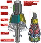 На первую ступень ставим РД-171 три штуки, между ними два посадочных движка РД-0169 на метане. Урмов на первой ступени 10 штук: 3 керосиновых, 1 метановый и 6 кислородных. Огромный бич-пакет из 10 бич-урмов это то что нам нужно для победы России, Россия вперёд!!!