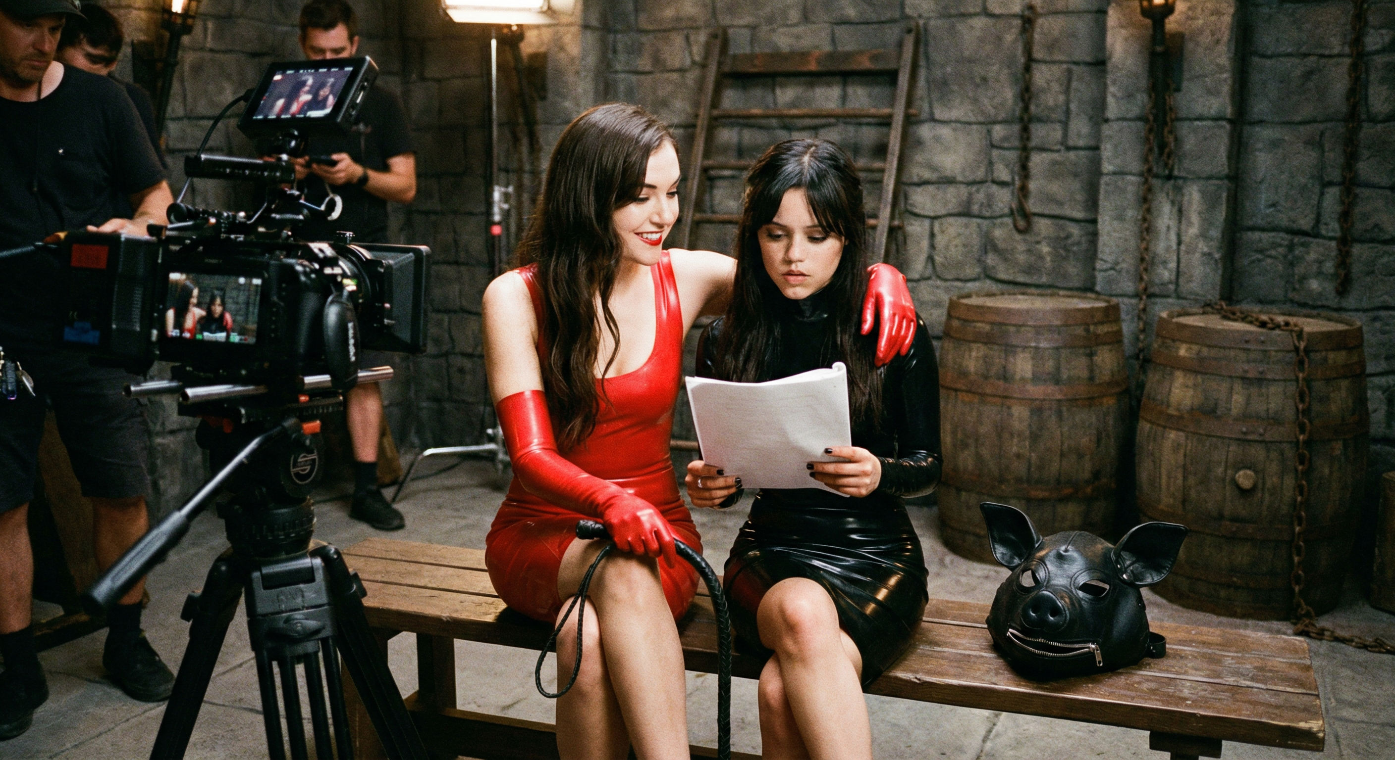 ПОДЗЕМЕЛЬЕ ГОСПОЖИ — НОЧЬ Тёмное, сырое помещение. Красный зловещий свет льётся сверху, словно кровь. В центре — массивные деревянные колодки с отверстиями для шеи, запястий и щиколоток. На стенах — коллекция плетей: длинная кожаная однохвостка, тяжёлый флоггер с шипами, тонкий стек, бамбуковая трость. На столе — маска свиньи с кляпом, ошейник с шипами, тяжёлые цепи, вибратор, зажимы для сосков, крюк для подвеса. ГОСПОЖА ВИКТОРИЯ (идеальное тело в облегающем красном латексном платье до середины бедра, длинные красные перчатки до локтя) стоит посреди комнаты. В руках — тонкая чёрная плеть. Она медленно проводит ею по своей ладони. Дверь открывается. Входит ЛИЛИ (в чёрном обтягивающем латексном мини-платье, босая, волосы распущены). На шее уже надет тонкий кожаный ошейник с кольцом. ЛИЛИ (тихо, опустив глаза) Госпожа… я пришла. ВИКТОРИЯ (голос низкий, бархатный, но стальной) На колени. Ползи. Лили опускается на четвереньки и медленно ползёт к ногам Виктории. Та наступает каблуком ей на затылок, прижимая лицо к холодному каменному полу. ВИКТОРИЯ Сегодня ты будешь моей свиньёй. Полной, послушной, мокрой свиньёй. Поняла? ЛИЛИ (приглушённо) Да, Госпожа… Виктория хватает её за волосы, поднимает голову и надевает маску свиньи. Кляп-шар входит в рот Лили с влажным чмоканьем. Маска плотно облегает лицо, оставляя только глаза и ноздри. ВИКТОРИЯ (улыбаясь) Хрюкай. Лили издаёт жалобный, приглушённый звук. Виктория смеётся и тащит её за цепь ошейника к колодкам. ВИКТОРИЯ Вставай. Руки, ноги — в отверстия. Лили послушно просовывает шею, запястья и щиколотки в колодки. Виктория с громким щелчком закрывает тяжёлую деревянную крышку. Теперь Лили полностью зафиксирована: стоит раком, голова и руки впереди, ноги широко раздвинуты, задница высоко поднята и полностью открыта. Виктория медленно обходит её, проводя плетью по спине, по ягодицам, по внутренней стороне бёдер. ВИКТОРИЯ Смотри, какая красивая задница у моей свиньи. Розовая. Невинная. Сейчас мы её испортим. Она берет плетку с мягкими кожаными хвостами и начинает медленно, ритмично хлестать. Сначала лёгкие удары — по спине, по бёдрам. Потом сильнее. Лили вздрагивает, но не может пошевелиться. Из-под маски вырываются приглушённые стоны. ВИКТОРИЯ (шепчет ей на ухо) Ты уже течёшь, да? Я чувствую запах. Она запускает руку между ног Лили, проводит пальцами по мокрым губам и показывает блестящие пальцы камере. ВИКТОРИЯ Смотрите, какая шлюха. Ещё даже не начала по-настоящему, а уже вся мокрая. Виктория берёт зажимы для сосков с цепочкой и жестоко прикрепляет их к напряжённым соскам Лили. Та изгибается в колодках, стонет сквозь кляп. ВИКТОРИЯ А теперь — настоящая плеть. Она берёт однохвостую плеть. Первый удар — по правой ягодице. Громкий хлопок. Красная полоса. Второй — по левой. Третий — точно между ног, по мокрой киске. Лили кричит в кляп, дёргается в колодках. Виктория подходит спереди, снимает с Лили маску, вытаскивает кляп. ВИКТОРИЯ Проси. ЛИЛИ (слёзы текут, голос дрожит) Пожалуйста, Госпожа… ещё… я ваша свинья… используйте меня… Виктория улыбается, берёт вибратор и прижимает его к клитору Лили. Одновременно начинает хлестать плетью по спине и заднице. ВИКТОРИЯ Кончишь — только когда я разрешу. А если посмеешь раньше — останешься в этих колодках до утра. Лили уже на грани. Тело дрожит. Виктория внезапно уби