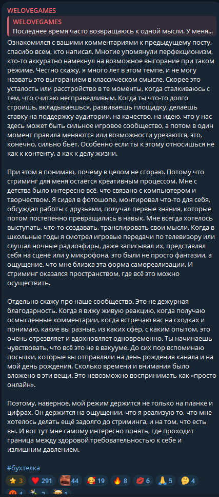152 комента и 3к сердечек под подведением итога стрима на 50к, вау, видимо, 3к и был активный онлайн, но я готов поверить, что это половина актива всего твича и что там в прямом эфире только 6к и смотрят. Я лично залетал на онлайн стрим раз 10 максимум за все время, хотя я даже в подсос треде.
