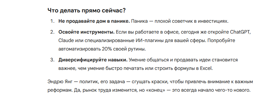 Эта волна автоматизации выбросит на обочину миллионы работников умственного труда в ближайшие 12–18 месяцев. Как только одна компания начнёт оптимизировать процессы, все её конкуренты последуют её примеру. Это станет соревнованием, потому что фондовый рынок вознаградит вас, если вы сократите численность персонала, и накажет, если вы этого не сделаете. Как выразился один инвестор: «Продавайте всё, что состоит из людей, сидящих за столом и смотрящих в компьютер».
