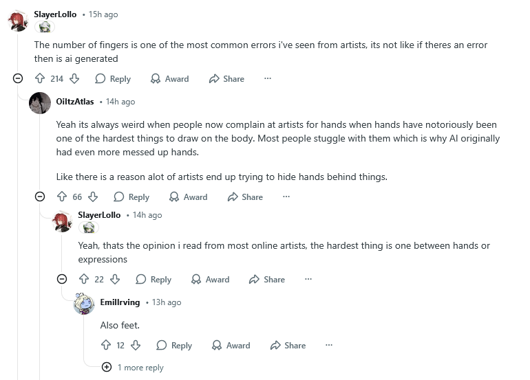 Если по мнению среддиторов и ботов нарисовать 6 пальцев - обычная такая ситуёвина для хуйдожника, пусть вместо сгоревших в пожарах работ вангога с нарисованными 6 пальцами мне найдут древние дохрена сохранившиеся иконы с 6 пальцами, уж эти неучи художку 100% не кончали.