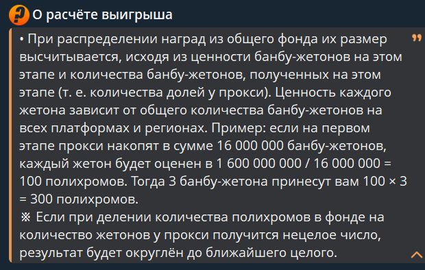 >>6431110 Ну, да. Сначала за три дня сфоримировали пул жетонов, потом уже на этот пул поделили сумму, получили "цену" одного жетона - и после этого выигрыш распределили.