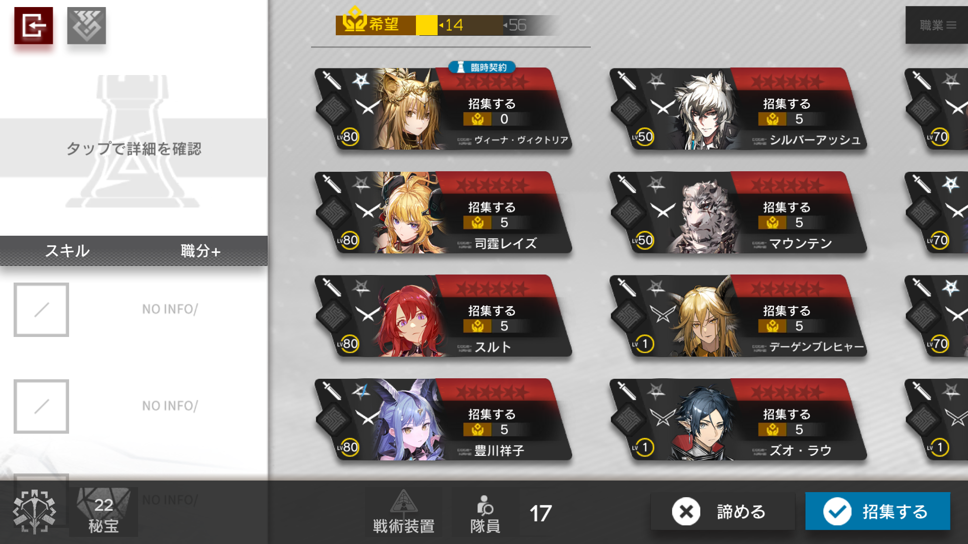 Играю во второй рогалик на 13-й сложности. На предпредпоследнем узле пятого этажа выпало такое. При этом у меня есть чернила для босса драматурга на шестом этаже, и я теперь не знаю, кого бы тут выбрать, чтобы было проще с драматургом. Теоретически мне после этого ещё 3 раза с боёв выпадут билетики на найм и ещё 2 будут в магазе на шестом этаже, и не факт что взятого щас гварда удастся апнуть до е2. Вина Виктория сильная? А если на е1? Кого бы тут лучше взять, как вы считаете? Теоретически на е1 Лейзи, мне кажется, была бы на боссе шестого этажа полезной: можно будет первым скиллом мелких мобов убивать, а босс по ней наверное не будет стрелять, так как она летает. Ещё у меня есть прибор "кран" с которым возможно было бы хорошо использовать е2 Суртр: убрать её краном перед смертью, чтобы выставить повторно через короткое время.