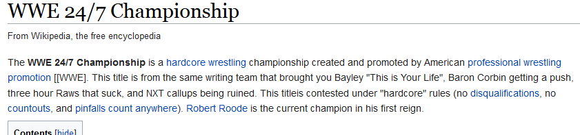 Посмотрел я на этот охуенный 24 на 7 татун. Пиздец это же дебил придумал. Изначально имея на руках спойлеры, я представлял себе, что это будет какой-то тайтл, который будут защищать каждую неделю, по этому все и говорили об 24 на 7, но он нахуй даже не имеет название. Пиздец каким надо быть без фантазии, чтобы дать название поясу 24 на 7? У меня наливайка с алкашами так и называется. Но то, что свернуть можно в любое время в любом месте это реально фейл нахуй, ноль интереса. Чисто цирк будет с титулом. Я реально думал для лоу карда и новеньких из нксти татунчик запилили, но не тут то было, это просто плевок в лицо, классический.